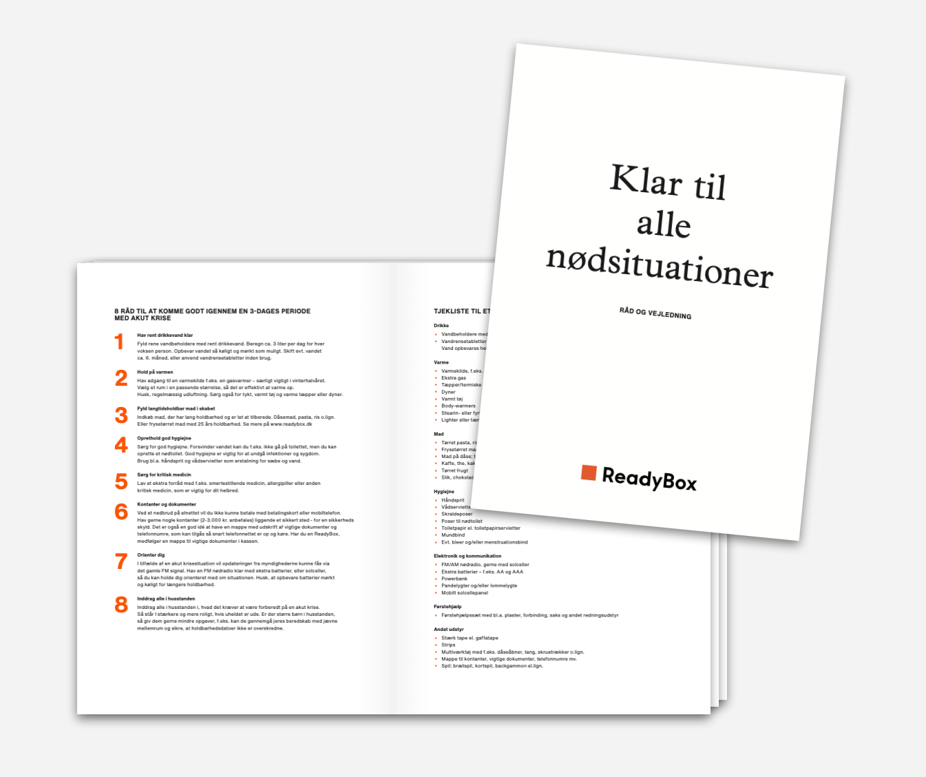 I vores gratis folder "Klar til alle nødsituationer" giver vi grundige råd og vejledninger til, hvordan man bedst forbereder sig på forskellige nødsituationer. Fra at opretholde adgang til varme og sikre tilstrækkelige madforsyninger, til at håndtere manglende adgang til basale nødvendigheder som vand og elektricitet. Vi klæder jeres medarbejdere eller medlemmer på til at stå stærkt i op til 72 timer uden hjælp udefra.